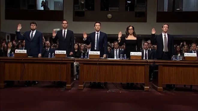 A few short weeks ago, Congress had a hearing with some of Social Media’s leading CEO’s including, but not limited to, Mark Zuckerberg, CEO of Meta, Jason Citron, CEO of Discord, Evan Spiegel, CEO of Snap, Linda Yaccarino, CEO of X, and Shou Zi Chew, CEO of Tik Tok. This was a follow up of what occurred back in March 2023 where the door was opened to the possibility of an ongoing battle of not only limiting social media, but potentially banning some of the biggest ones here in the US. Tik Tok being one of the biggest aggressors, according to Congress, which brought about the topic of potential exploitation and paranoia of children and younger adults in general being exposed to certain sexual content, as well as users in general being lured by posts about fake content and AI-made videos. The reason I wanted to pick this subject is because it becomes very relevant in the aspects of the usage rate of social media in the modern age and how we’re still learning to regulate the internet altogether by keeping up with its algorithm. Not only that but it is vital for journalists to keep an eye on these types of subjects as they maintain a heading and knowledge of what we may be impacted upon on our day-to-day life. I also wanted to make this about the pictures that are represented from this event as I feel they add the most context possible and provide the clearest picture of them all, no pun intended.