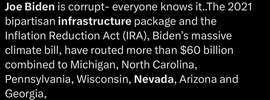 To find official reactions on social media proved a bit harder to find on Twitter, which seemed like the breeding ground for any debate to pop up. The occasional “Joe Biden is corrupt”, tweet would pop up and offer little insight of adequate and well structured arguments that may be made about why this infrastructure deal here in Nevada is a bad idea. Another tweet celebrated Biden’s achievement but then turns around and brings Trump into the mix by stating “think Trump cares about trains? or infrastructure?…Don’t vote for a nightmare!” This twitter user simply just brings irrelevancy into the topic of talking about both infrastructure and the improvement of Nevada. Another Twitter user would argue that actually we need to connect more in-state transportation, from Las Vegas to Reno, but then the argument goes off the deep end when they bring up at the very end, “We don’t need to import any more leftism from California.” Which to me loses all credibility for its argument already, trying to bring irrelevant topics into something that has no correlation.